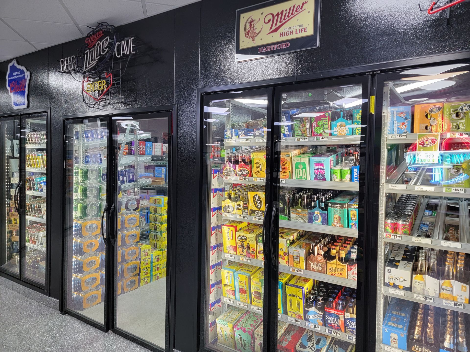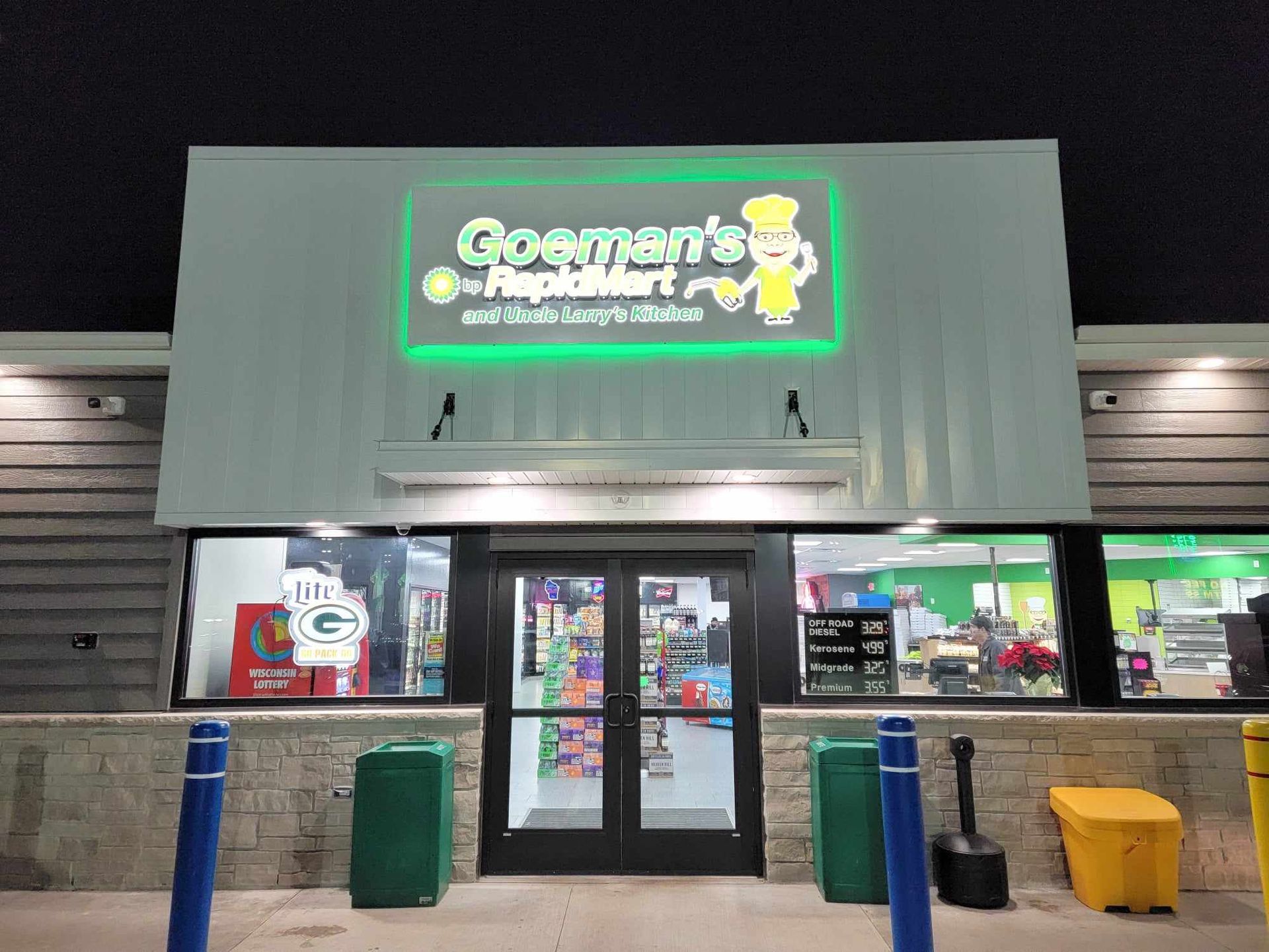 Goeman's RapidMart is your one-stop destination for essentials: offering the lowest prices on beer, wine, liquor, and Widmers cheese. Fuel up with gas, diesel, kerosene, and propane, or grab live bait and tackle for your next fishing trip. Enjoy Uncle Larry’s homemade pizza, and a vast selection of craft beers from the walk-in cooler. Plus, take advantage of services like propane fill-ups, drive-thru for quick shopping, beer wagon rentals, and D.O.T. plate renewals. Everything you need, and more!